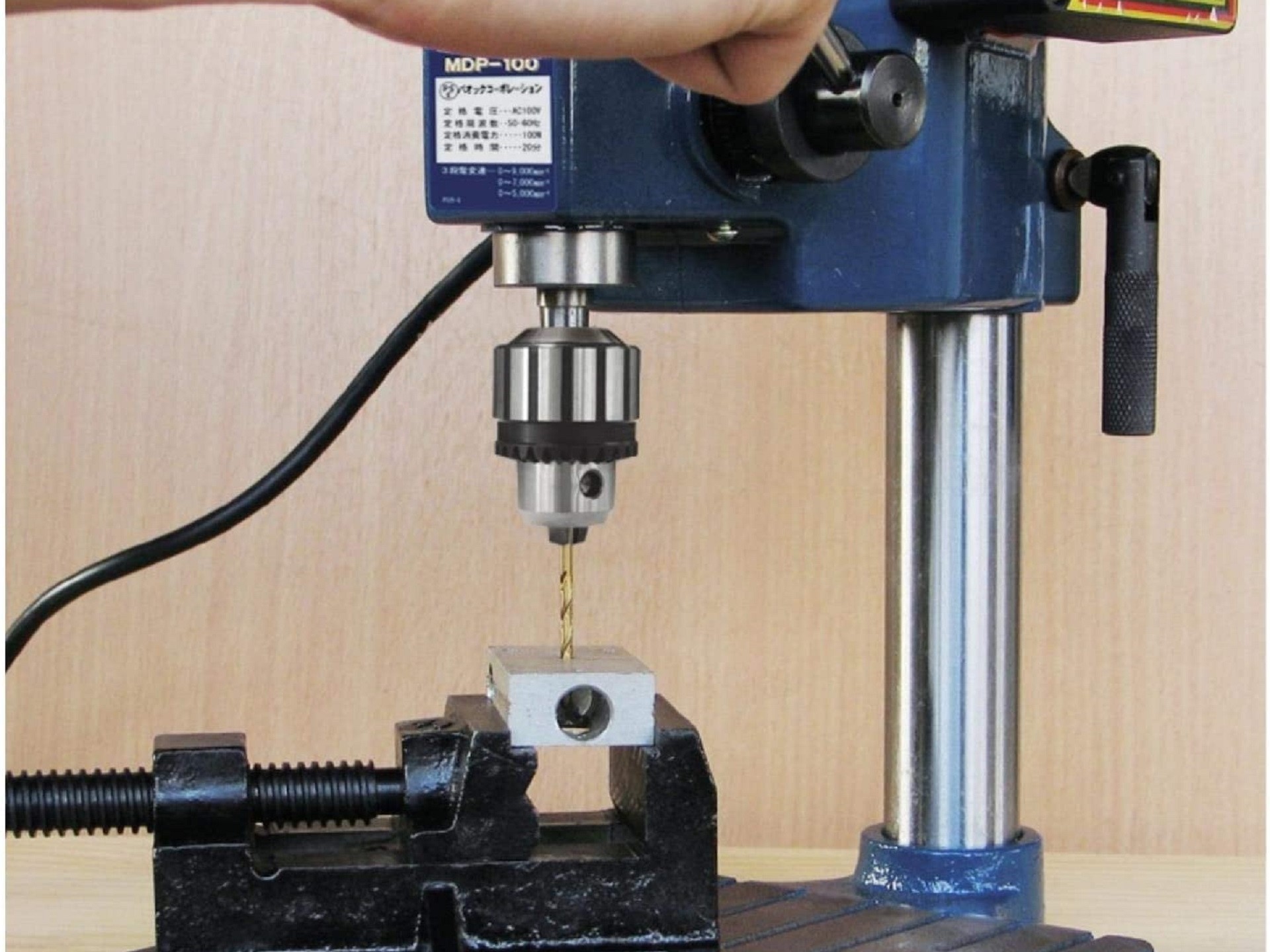 定規基準でワークをセットし、ハンドルを手動で回し、上部のカウンターで位置決め、ハンドルでセンタードリルを押し付け加工